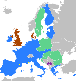 Groen = EU-landen die VERPLICHT zijn om de Euro in te voeren